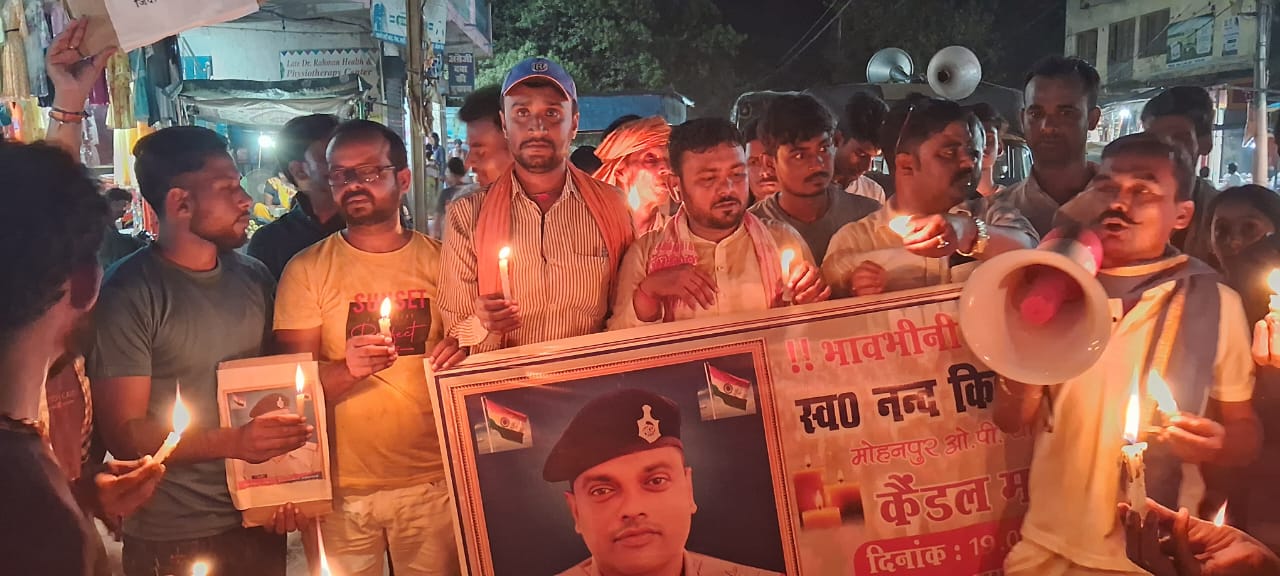 शनिवार को संध्या के समय समस्तीपुर जिले के मोहिउद्दीन नगर के युवा नेता राम मोहन राय के नेतृत्व में शहिद SHO नंदकिशोर यादव के शहादत पर मोहिउद्दीन नगर के भाजपा,लोजपा राजद पार्टी के संचालन में युवा नेताओं संघ मोहिउद्दीन नगर प्रखंड क्षेत्र के तमाम युवाओं ने आक्रोषपूर्ण कैंडल मार्च निकाल कर एकता का परिचय देते हुए शहीद नंदकिशोर यादव अमर रहें नारों के साथ पूरा क्षेत्र गुंजायमान हो उठा। विस्तार पूर्वक जानकारी के लिए क्लिक करें ऑडियो पर और सुनें पूरी खबर।