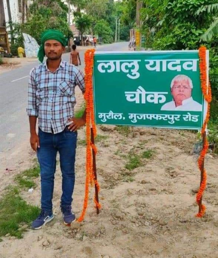 लालू समर्थकों ने उनके जन्मदिन पर चौक का नाम लालू चौक रखा मुजफ्फरपुर के राजद कार्यकर्ताओं ने मुरौल चौक का नाम बदल कर लालू चौक रख दिया
