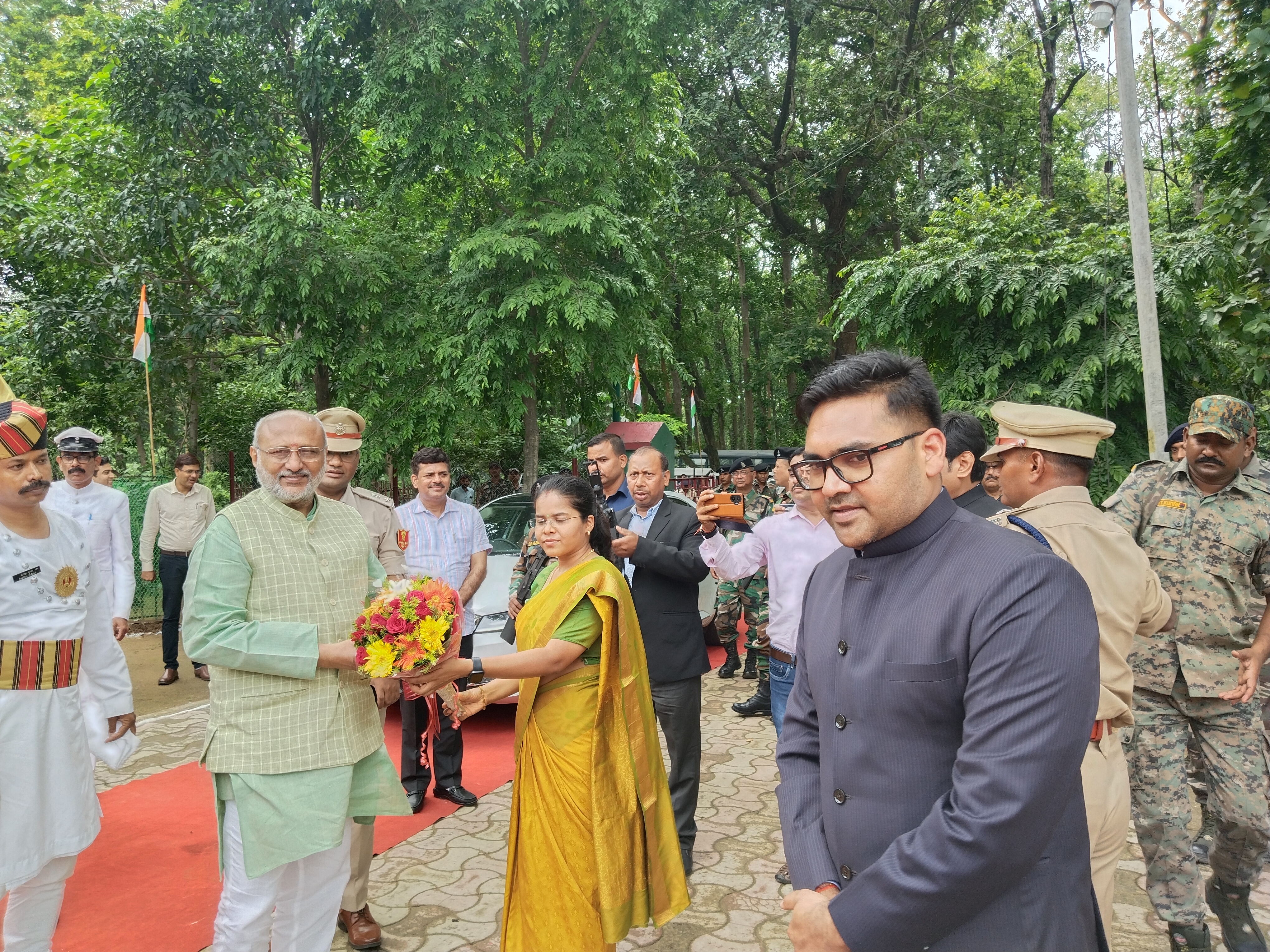पेटरवार. झारखण्ड राज्य के महामहिम राज्यपाल सी.पी. राधाकृष्णन सोमवार को रांची से दुमका यात्रा के क्रम में कुछ समय के लिए पेटरवार स्थित फॉरेस्ट गेस्ट हाउस में पड़ाव किए. जहां बोकारो उपायुक्त कुलदीप चौधरी, पुलिस अधीक्षक प्रियदर्शी आलोक, जिला वन प्रमंडल पदाधिकारी रजनीश कुमार, डीडीसी कीर्तीश्री ने बुके दे कर स्वागत किया. राज्यपाल सीपी राधाकृष्णन को सर्जेन्ट मेजर अजित कुमार झा के नेतृत्व में महिला सशस्त्र बल द्वारा गार्ड ऑफ ऑनर दिया गया. मौके पर जिला, अनुमंडल व प्रखंड स्तर के कई प्रशासनिक पदाधिकारी उपस्थित थे.