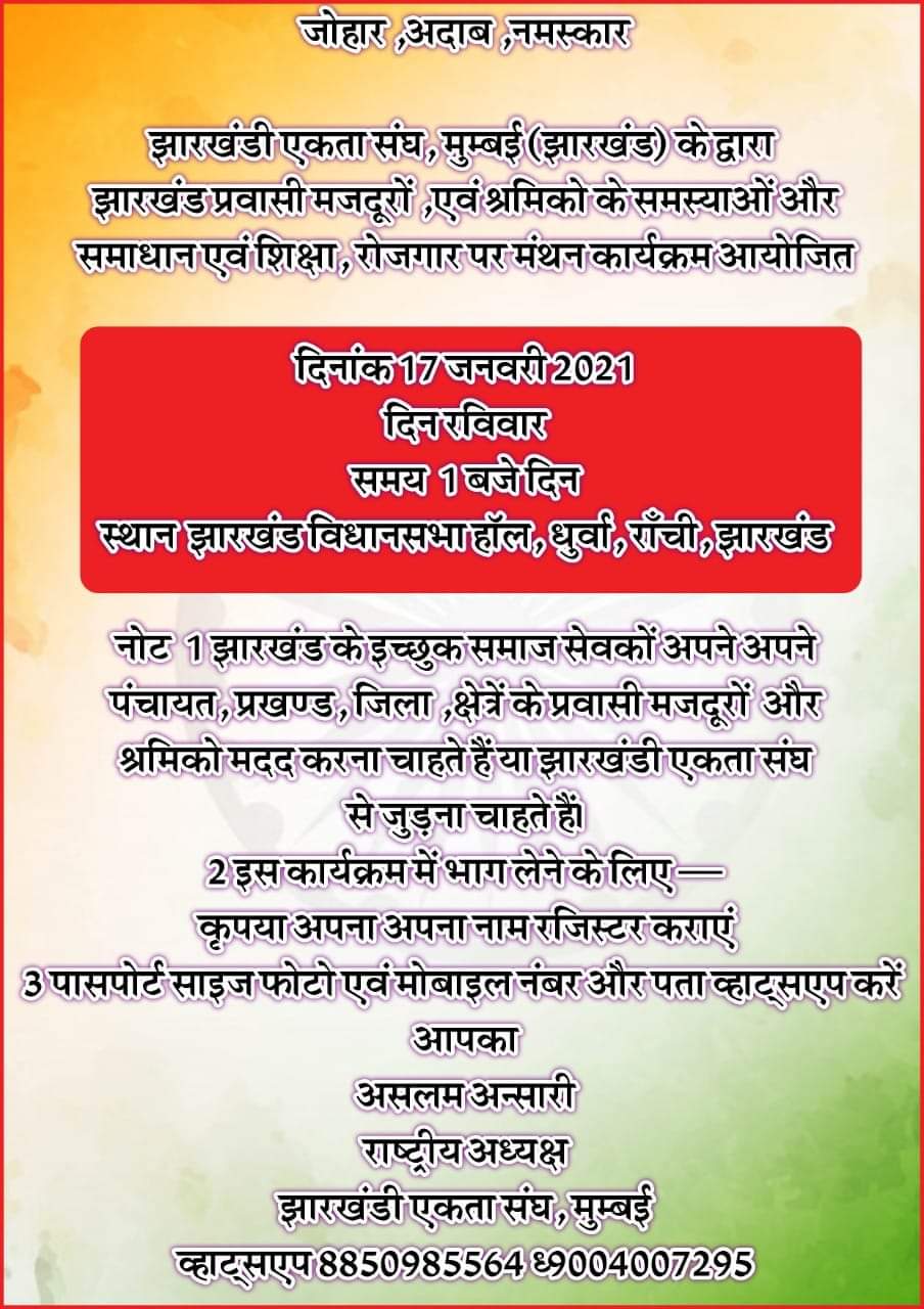 झारखंड मोबाइल वाणी पर गिरिडीह से सर्वेश तिवारी बताते हैं कि प्रवासी मजदूरों की समस्या और समाधान तथा शिक्षा रोजगार पर कार्य कर रही संस्था झारखंडी एकता संघ के राष्ट्रीय अध्यक्ष असलम अंसारी ने कहा कि सरकार को प्रवासी मजदूरों के सर्वेक्षण होती आयोग का गठन कर उनकी समस्याओं का समाधान निकालना चाहिए।पेश है उनसे बातचीत के अंश।