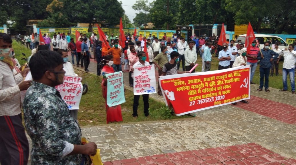 झारखण्ड राज्य धनबाद जिला बगोदर गिरिडीह से सोहम ने मोबाइल वाणी केमाध्यम से बताया कि भाकपा माले बगोदर प्रखंड कमिटी के द्वारा राज्यब्यापी कार्यक्रम के तहत गुरुवार को प्रखंड कार्यालय मे एक दिवसीय धरना-प्रदर्शन किया।राशन,आवास,प्रवासी मजदूरों को भत्ता,मनरेगा मजदूरी मे वृद्घि और स्थानीयता नीति मे परिवर्तन को लेकर प्रखंड कार्यालय में प्रदर्शन किया। प्रदर्शन के बाद 11 सूत्री माँग पत्र प्रखंड विकास पदाधिकारी को सौंपा। कार्यक्रम की अध्यक्षता व संचालन प्रखंड मुस्ताक अंसारी ने किया। कार्यक्रम मे पवन महतो संदीप जायसवाल,पूनम महतो,पूरन कुमार महतो सहित दर्जनों लोग शामिल थे।