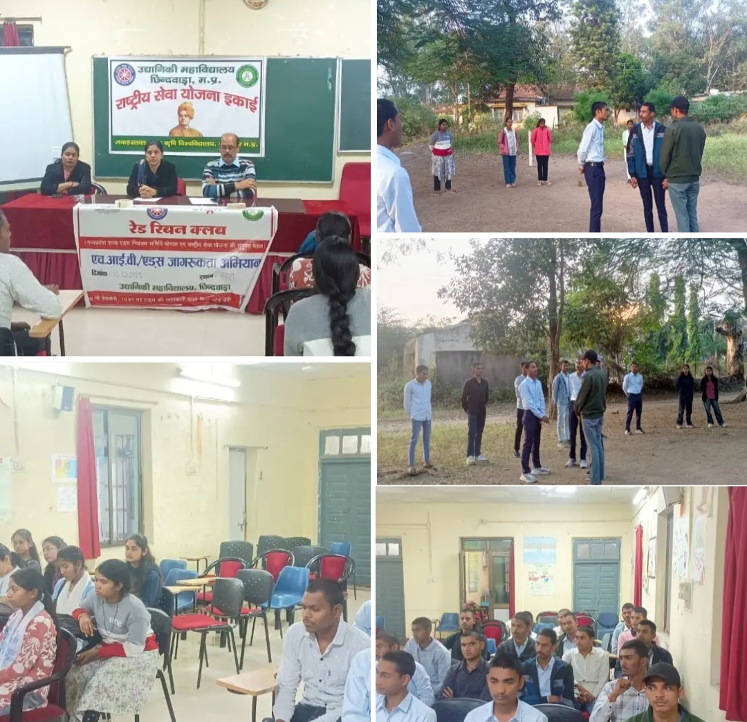 उद्यानिकी महाविद्यालय छिंदवाड़ा में आज राष्ट्रीय सेवा योजना इकाई एवं रेड रिबन क्लब इकाई की कार्यक्रम समन्वयक डॉ.शिखा शर्मा, प्रभारी अधिष्ठाता डॉ.गौरव महाजन व डॉ.हेमलता अहिरवार के मार्गदर्शन में प्रथम वर्ष के छात्र-छात्राओं ने एड्स के इतिहास, लक्षण, संक्रमण के कारण एवं निवारण विषय में अपने विचार व्यक्त किये।साथ ही एचआईवी एड्स जागरूकता अभियान के तहत छात्राओं ने कॉलेज प्रांगण में नुक्कड़ नाटक का प्रदर्शन किया । कार्यक्रम के अंत में छात्राओं द्वारा सभी को सुरक्षित जीवन शैली के लिये शपथ भी दिलाई गई।