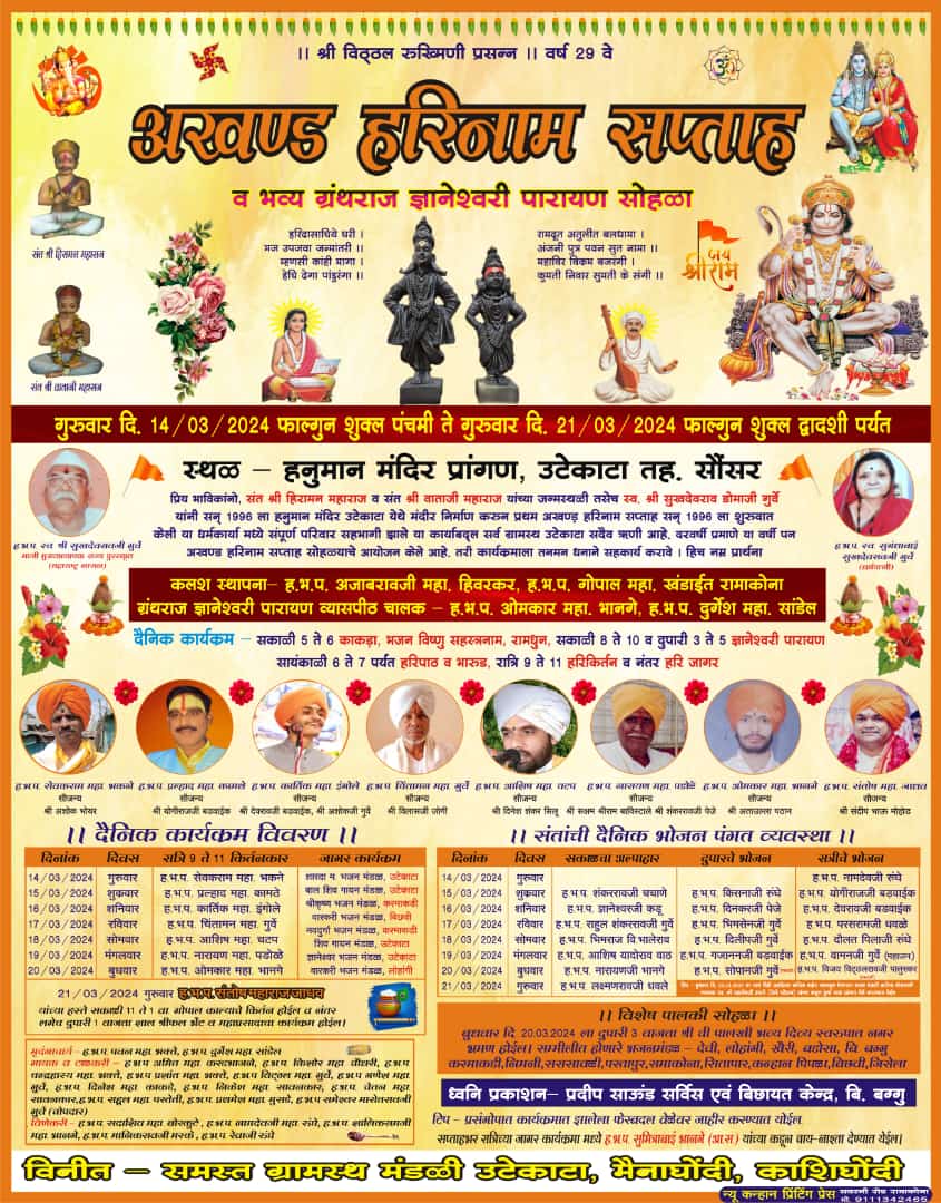 ग्राम उटेकाटा में अखंड हरिनाम संकीर्तन सप्ताह 14 मार्च से ---------------------------------------- ब्रम्हलीन संत श्री हिरामन महाराज व बंधू ब्रम्हलीन संत श्री वाताजी महाराज की जन्मस्थली ग्राम उटेकाटा में अखंड हरिनाम संकीर्तन सप्ताह 14 मार्च से 21 मार्च 2024 तक हनुमान मंदिर प्रांगण में आयोजित हो रहा है । सप्ताह को लेकर ग्राम मे तैयारीयां प्रारंभ हो चुकी है । सप्ताह के अंतर्गत काकड़ा, ज्ञानेश्वरी पारायण, हरिपाठ, किर्तन आदि कार्यक्रम सप्ताह भर होंगे । 21 मार्च को दहीलाही किर्तन एवं महाप्रसाद के साथ सप्ताह की समाप्ति होगी । ज्ञात हो की पैठनतूल्य श्री तीर्थ क्षेत्र रामाकोना में प्रतिवर्ष रंगपंचमी के दुसरे दिन से भरने वाले शांति ब्रम्ह एकनाथ महाराज षष्ठी महोत्सव के प्रणेता संत श्री हिरामन महाराज व बंधू संत श्री वाताजी महाराज के पालकी भ्रमण भी होगा इस कार्यक्रम में क्षेत्र के भजन मंडलीया प्रमुख रूप से उपस्थित रहेंगी।