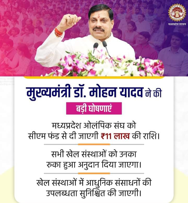 मुख्यमंत्री डॉ. मोहन यादव ने भोपाल में आयोजित कार्यक्रम में की बड़ी घोषणाएं... मध्यप्रदेश ओलंपिक संघ को ₹11 लाख की राशि सभी खेल संस्थाओं को दिया जाएगा अनुदान Dr Mohan Yadav