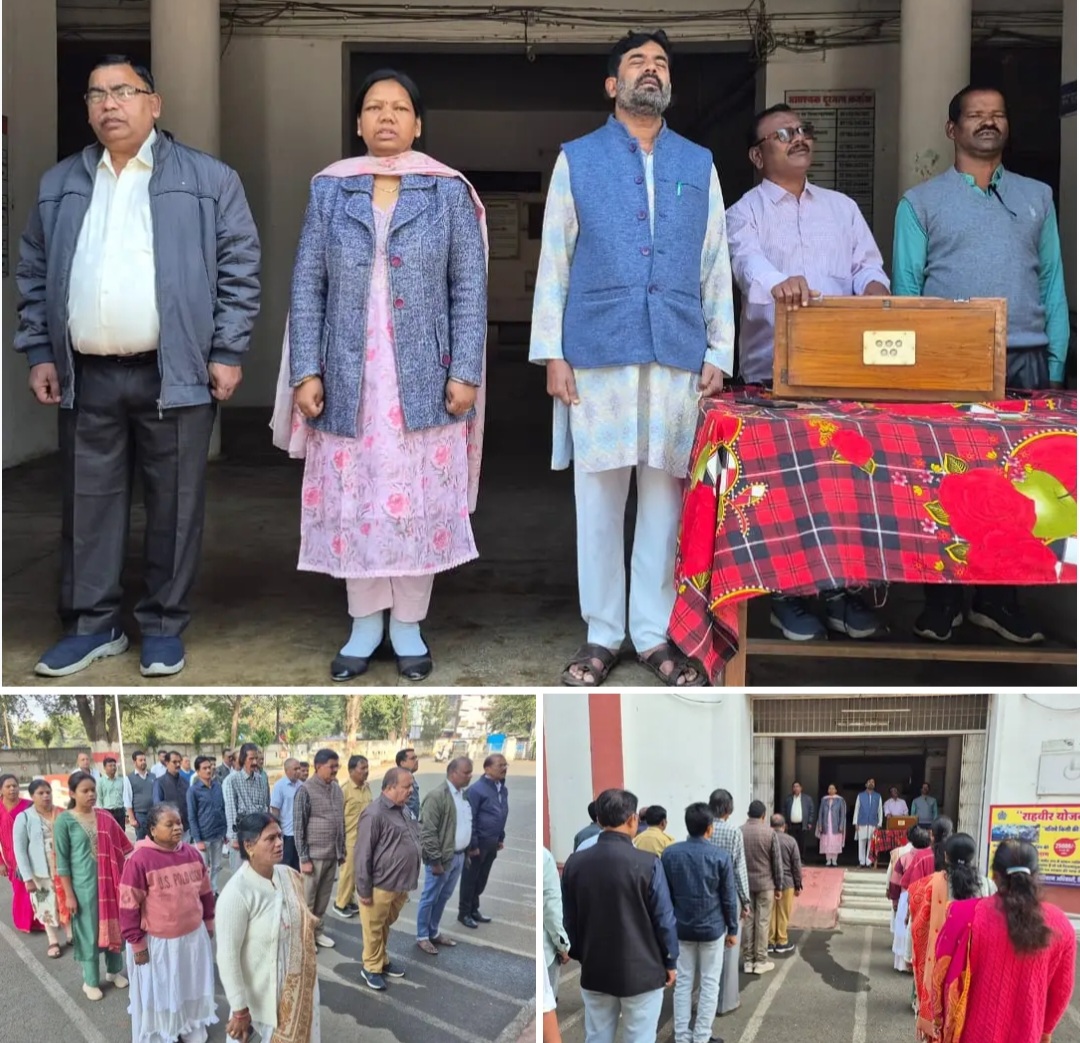 राज्य शासन के निर्देशानुसार आज माह के प्रथम कार्यदिवस पर राष्ट्र-गान एवं राष्ट्र-गीत गायन के बाद कार्यालयीन गतिविधियां प्रारंभ हुईं। कलेक्टर कार्यालय के प्रांगण में कलेक्टर श्री हरेंद्र नारायन के मार्गदर्शन में संयुक्त कलेक्टर श्रीमती ज्योति ठाकुर व डिप्टी कलेक्टर श्री आर.के.मेहरा के साथ विभिन्न विभागों के अधिकारियों व कर्मचारियों ने राष्ट्र-गान 'जन गण मन' एवं राष्ट्र-गीत 'वंदे मातरम्' का सामूहिक गायन किया। शासकीय कलापथक दल के प्रमुख कलाकार श्री नरेन्द्र पाल द्वारा अन्य कलाकारों के साथ राष्ट्र-गान एवं राष्ट्र-गीत का संगीत के साथ गायन कराया गया।