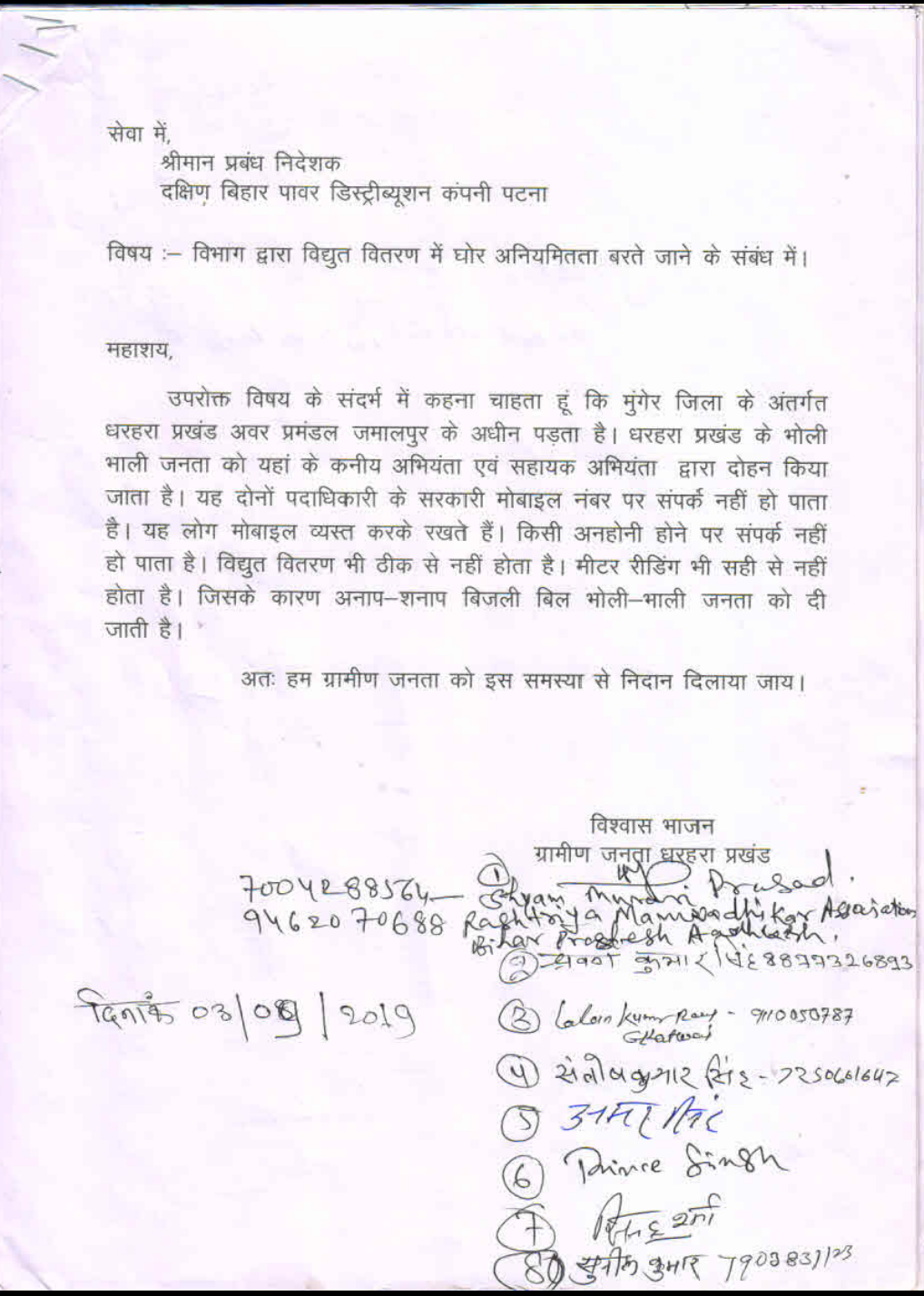 धरहरा प्रखंड मे बिजली विभाग के कर्मचारी के खिलाफ लगातार शिकायत एवं जनता के आक्रोश को देखते हुए राष्ट्रीय मानवाधिकार एसोसिएशन के बिहार प्रदेश अध्यक्ष श्री श्याम मुरारी प्रसाद ने इस मुद्दे को गंभीरता से लेते हुए कनीय अभियंता एवं सहायक अभियंता के खिलाफ साउथ बिहार पावर डिस्ट्रीब्यूशन कंपनी पटना के प्रबंध निदेशक को आवेदन मेल के माध्यम से दिया है।गियात हो कि धरहरा पावर ग्रिड के द्वारा लगातार बिजली आपूर्ति मे कमी एवं बिजली विभाग के कर्मचारीयो के द्वारा मीटर रीडिंग में लापरवाही करने से अनाप- शनाप बिजली बिल आने से धरहरा प्रखंड के लोग विभाग के खिलाफ काफी आक्रोशित थे,उन्होंने कर्मचारियों की लापरवाही की शिकायत बिजली विभाग के कनीय अभियंता एवं सहायक अभियंता को दी थी,मगर वे लोग इस लापरवाही को नजरअंदाज कर दिये,जिसके बाद श्याम मुरारी प्रसाद एवं धरहरा की जनता ने मिलकर यह कदम उठाया।