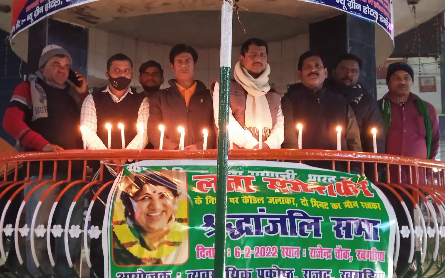 ऐ मेरे वतन के लोगों " सामूहिक गान गाकर लता मंगेशकर को कैंडल जलाकर दी गई भावभीनी श्रद्धांजलि खगड़िया जिला के राजेंद्र चौक के समीप केंडल जलाकर भारत रत्न एवं सुप्रसिद्ध गायिका लता मांगेशकर ने निधन पर दो मिनट का मोन रख उनके तेल चित्रपर दी श्रद्धांजलि राष्ट्रीय जनता दल व्यवसायिक प्रकोष्ठ एवं देश बचाओ अभियान के संयुक्त तत्वाधान में स्वर कोकिला भारत रत्न प्रसिद्ध गायिका लता मंगेशकर के निधन पर राजेंद्र चौक पर कैंडल जलाकर तथा 2 मिनट का मौन रखकर श्रद्धांजलि दी गई तथा लता मंगेशकर अमर रहे नारों को बुलंद किया गया।इस अवसर पर देश बचाओ अभियान फरकिया मिशन के संस्थापक अध्यक्ष किरण देव यादव, सेल के अध्यक्ष शंभू पोद्दार, राजद नेता प्रताप राज गुड्डू , पंकज यादव, बिट्टू कुमार, नीरज कुमार, गायिका चंपा राय सहित दर्जनों छात्र नौजवानों ने " ऐ मेरे वतन के लोगों, जरा आंख में भर लो पानी, जो शहीद हुए हैं उनको, जरा याद करो कुर्बानी " सामूहिक गान गाकर लता मंगेशकर को श्रद्धांजलि दिया।समाजसेवियों ने कहा कि देश को अपूरणीय क्षति हुआ है , निकट भविष्य में भरपाई संभव नहीं, गायन के क्षेत्र में गहरा आघात पहुंचा है, लता मंगेशकर सच्चे अर्थों में स्वर कोकिला थी, इनकी आवाज सदैव अमर रहेगी।