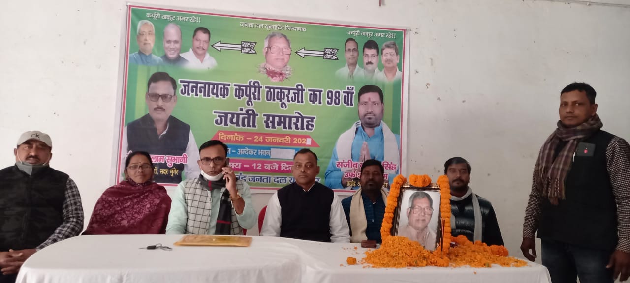 सोमवार को सदर प्रखंड के अंबेडकर भवन में जदयू द्वारा जन नायक कपूरी ठाकुर की जयंती समारोह का आयोजन किया गया जिसकी अध्यक्षता जदयू प्रखंड अध्यक्ष संजीव कुमार उर्फ सालिकराम सिंह ने की है उन्होंने कहे की बिहार के मुख्यमंत्री रहे स्वर्गीय कपूरी बाबू को लोग उनकी सादगी भरे जीवन के लिए सदा याद रखेंगे इस मौके पर जिला उपाध्यक्ष विपिन कुमार सिंह ने भी अपनी संबोधन में कहा कि ऐसे महान व्यक्ति थे कपूरी बाबू जिन्हें सदैव भुला नहीं जा सकता है। अन्य नेताओं ने भी उन्हें श्रद्धा सुमन अर्पित किए। इस मौके पर जनता दल यू के जिला महासचिव राकेश कुमार रंजन, बुद्धिजीवी प्रकोष्ठ के अनिल यादव, सत्यजीत प्रकाश, जिला उपाध्यक्ष विपिन सिंह, अजय कुमार सिंटू इत्यादि गन्ने मान जदयू नेता उपस्थित थे।