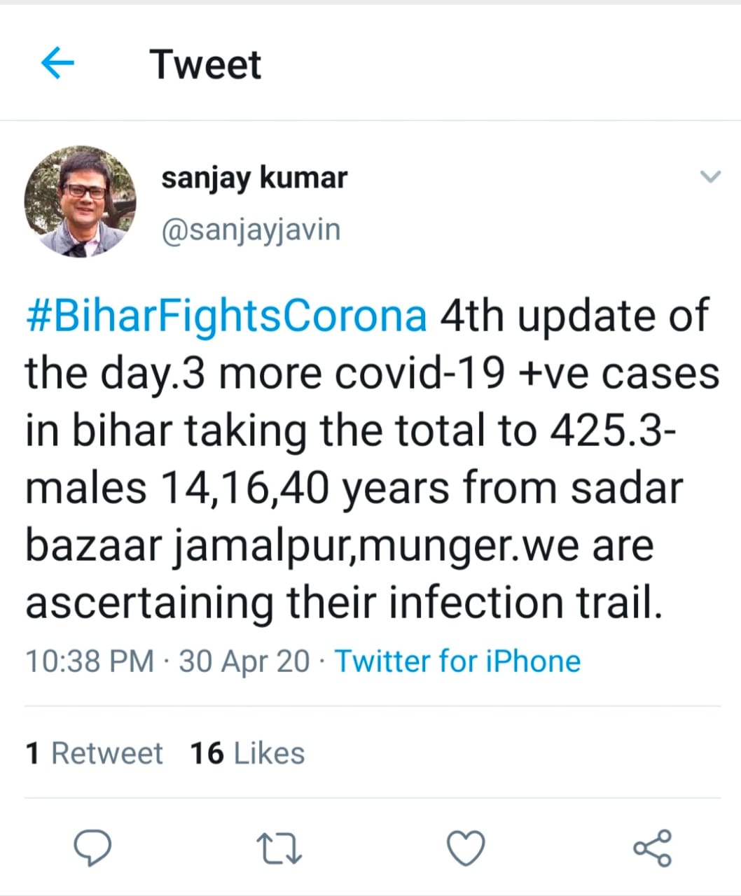 अमरनाथ गुप्ता (जमालपुर संवादाता) जमालपुर शहर में गुरुवार की रात्रि फिर तीन और करो ना पॉजिटिव मरीज के पाए जाने से जमालपुर शहर में हड़कंप मच गया है यह सभी कोरोना पॉजिटिव मरीज जमालपुर के सदर बाजार के हैं बिहार राज्य के स्वास्थ्य सचिव संजय कुमार ने चौथे अपडेट में बताया है कि जमालपुर शहर से तीन कोरोना पॉजिटिव मरीज मिले हैं जिसका का उम्र 14 साल 16 साल और 40 साल है यह सभी पुरुष है इसके साथ ही बिहार में पॉजिटिव मरीजों की संख्या अब तक 425 हो गया है