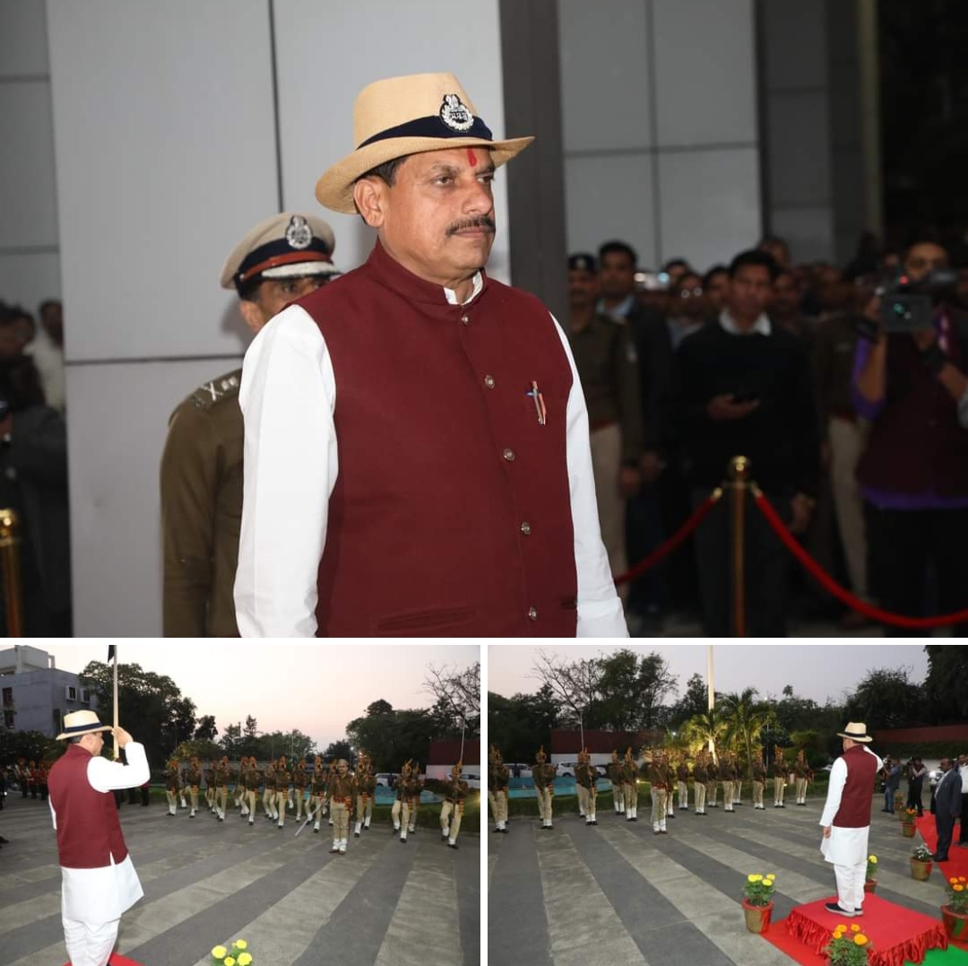 मुख्यमंत्री डॉ मोहन यादव के पुलिस मुख्यालय आगमन पर पुलिस बैंड के साथ पुलिस जवानों द्वारा उन्हें सलामी दी गई