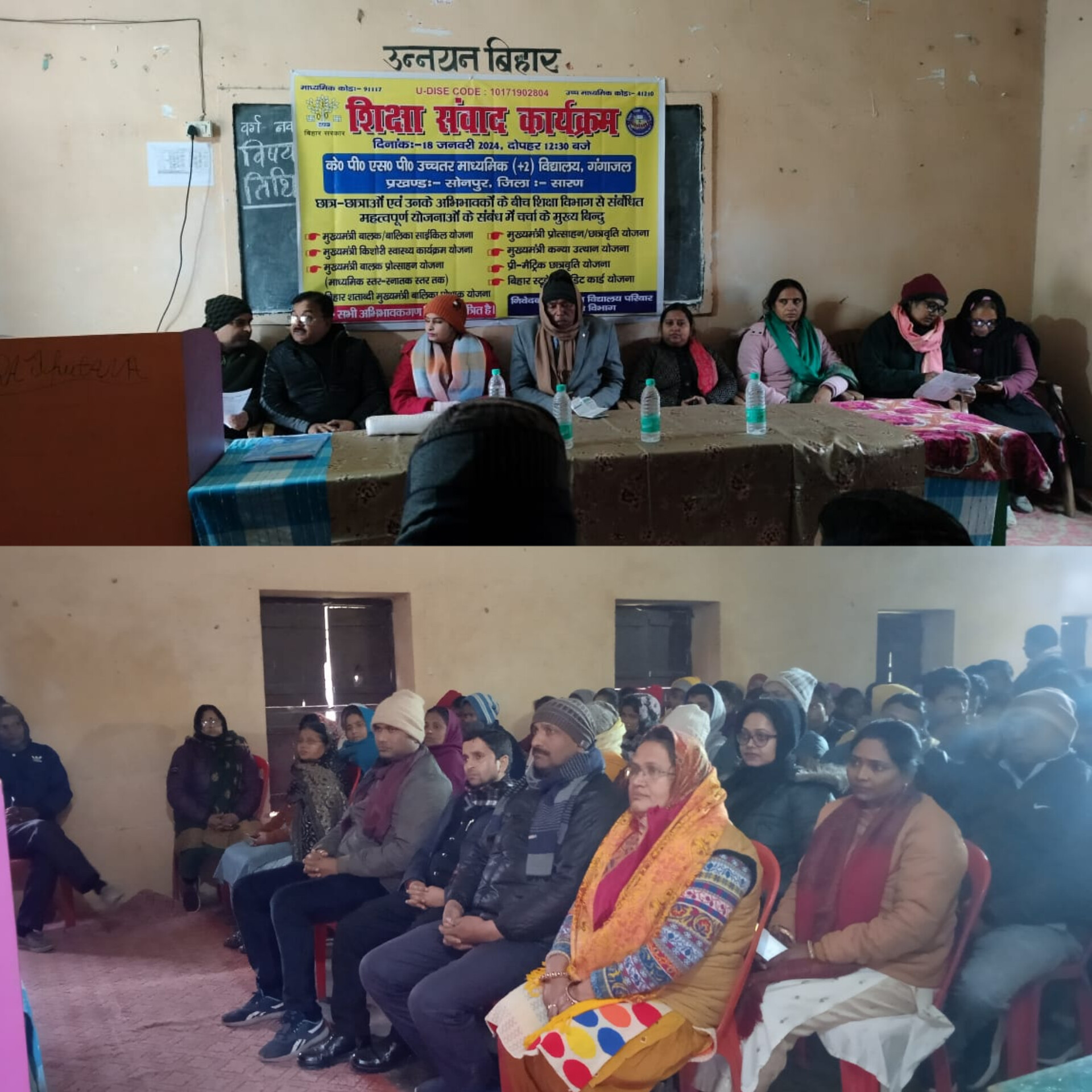 सोनपुर प्रखंड क्षेत्र के भरपुरा पंचायत के केपीएसपी उच्चतर माध्यमिक ( + 2 ) विद्यालय गंगाजल में गुरुवार को शिक्षा संवाद कार्यक्रम आयोजित किया गया। इस संवाद कार्यक्रम का अध्यक्षता विधालय के प्राचार्य स्मृति कणा ने की । कार्यक्रम का संचालन व उदघोषक शिक्षक प्रभात कुमार सिंह ने किया। कार्यक्रम का धन्यवाद ज्ञापन सुबोध कुमार ने किया । शिक्षा संवाद कार्यक्रम में मुख्य अतिथि के रूप में प्रखंड शिक्षा पदाधिकारी डॉ अवधेश साह , श्रीमती श्वेता कुमारी बाल विकास परियोजना पदाधिकारी ,डॉक्टर सौम्या सिंह आपूर्ति निरीक्षक सोनपुर , शिक्षक अमरनाथ ओझा रहे । संवाद कार्यक्रम में विधालय के शिक्षक संतोष कुमार, रामदेव मंडल ,सुधीर कुमार ईश्वर ,सुबोध नारायण सिंह ,विनोद कुमार राय, बालेश्वर कुमार यादव ,शिक्षिका रीना देवी ,सोनी कुमारी, कुमारी संगीता, कुमारी शालिनी सहित अन्य शिक्षक, शिक्षिका, छात्र, छात्राएं एवं विधालय में पढ़ने वाले बच्चों के अभिभावक उपस्थित रहे। सरकार की दिशा निर्देश के अनुसार शिक्षा संवाद कार्यक्रम में विद्यार्थियों एवं उनके अभिभावकों के बीच शिक्षा विभाग से संबंधित महत्वपूर्ण योजनाओं के संबंध में विस्तार से विभागीय अधिकारी व स्कूल के शिक्षक गणों ने विद्यार्थियों व उनके अभिभावकों को सरकार से मिलने वाली सहायता व योजनाओं को विस्तार से क्रमबद्ध तरीके से संबंधित अधिकारियों ने जानकारी दी । संवाद कार्यक्रम को संबोधित करते हुए प्रखंड शिक्षा पदाधिकारी अवधेश साह ने कहा कि यह शिक्षा जन संवाद अभिभावक के साथ हमेशा किया जाता है। इसका मुख्य उद्देश्य यह है कि बिहार सरकार द्वारा शिक्षा संबंधित चलायें जा रहे सभी योजनाओं को बच्चों के अभिभावक के साथ साझा किया जा सके एवं विद्यालय संबंधित होने वाला असुविधा को अभिभावक से जानकारी प्राप्त हो सके। कुछ महत्वपूर्ण शिक्षा संबंधित मिलने वाले योजना को शिक्षा पदाधिकारी ने साझा भी किया। बाल विकास परियोजना पदाधिकारी श्रीमती श्वेता कुमारी ने उपस्थित विद्यार्थियों को संबोधित करते हुए कहीं की जीवन में कुछ बनना है तो शिक्षा ग्रहण करना अति आवश्यक है ।विद्यार्थियों को पठन-पाठन के लिए कई योजनाएं सरकार चला रही है आंगनवाड़ी केंद्र में पढ़ने वाले बच्चे से लेकर उच्च शिक्षा ग्रहण करने वाले विद्यार्थियों को सरकार योजनाओं के तहत कई सहायता उपलब्ध करा रही है। जिन योजनाओं का लाभ विद्यार्थी समय से स्कूल पहुंचे और शिक्षा ग्रहण करें तो निश्चित ही योजनाओं का लाभ उठा सकते हैं । सोनपुर आपूर्ति निरीक्षक डॉक्टर सौम्या सिंह ने कहे कि विद्यार्थियों को जीवन में शिक्षा से बड़ा कोई चीज नहीं है। शिक्षा ग्रहण करने के लिए लगन मेहनत और दृढ़ इच्छा शक्ति जरूरी है तभी मुका