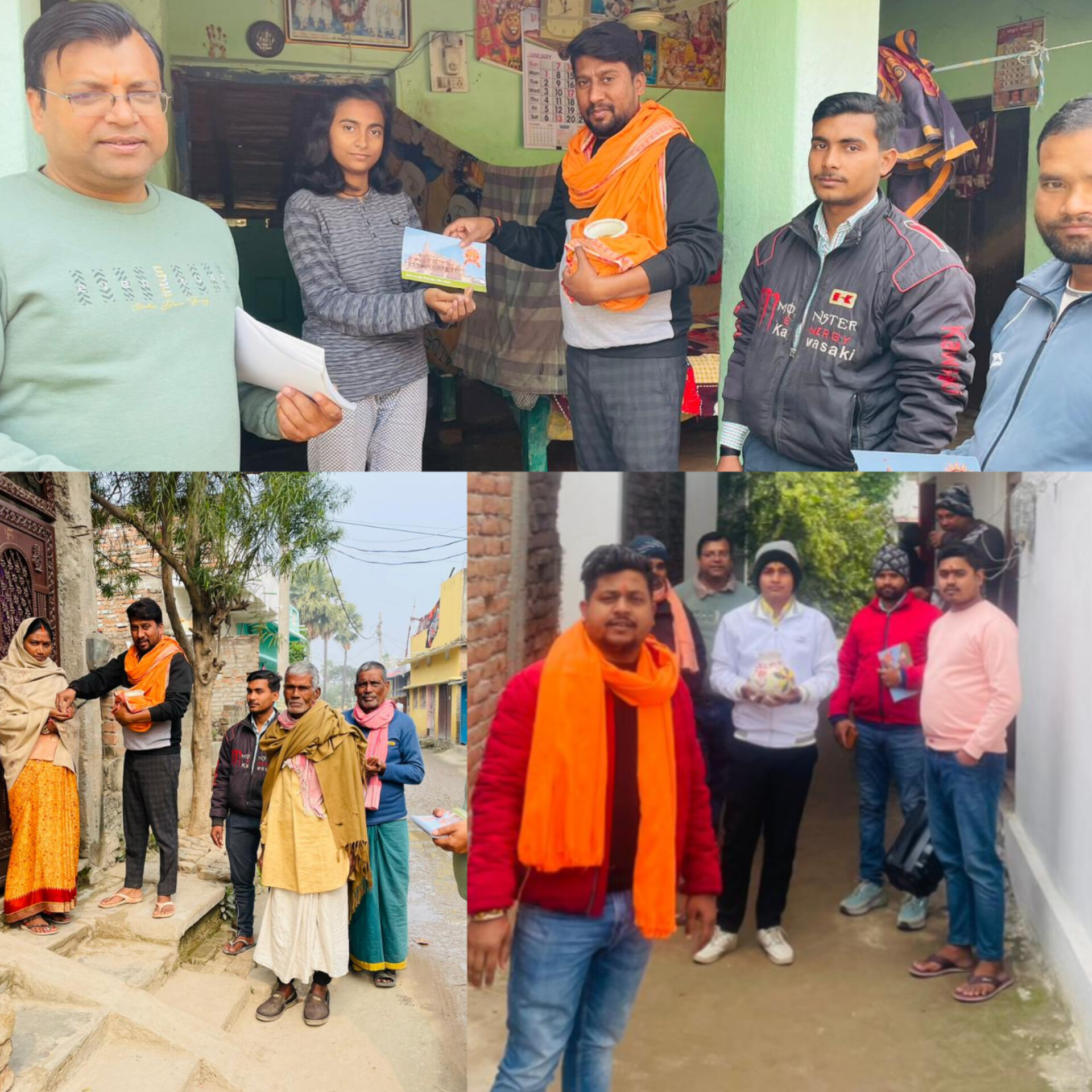घर-घर वितरण किया जा रहा अयोध्या से आई पुजित अक्षत व फ़ोटो सोनपुर । सोनपुर प्रखंड के अंतर्गत भरपुरा पंचायत में घर-घर लोगों के बीच भाजपा के कार्यकर्ताओं ने पहुंचकर अयोध्या में बन रहे हैं श्री राम लाला के मंदिर से आए पुजित अक्षत के वितरण करते हुए 22 जनवरी को रामलाल की प्राण प्रतिष्ठा कार्यक्रम को देखने और उस दिन अपने-अपने घरों में दीपक जलाकर दीप उत्सव मनाने तथा अपने घर से दीपक लेकर अपने आसपास के मंदिरों में प्रज्वलित करने को कहा गया साथ ही घर-घर में घूम-घूम कर सभी लोगों को अक्षत और अयोध्या में बने श्री राम मंदिर की फोटो को लोगों के बीच भाजपा के कर्मठ कार्यकर्ता आशीष श्रीवास्तव, आलोक कुमार सिंह, अजय पासवान ,आदित्य कुमार, दीपक कुमार, ऋतुराज उपाध्याय सहित अन्य कार्यकर्ताओं ने पूजित अक्षत को वितरण करते हुए आग्रह किया कि अपने जीवन काल में एक बार जरूर श्री राम लाला का दर्शन करने के लिए अयोध्या जाए और राम के आदर्श और सिद्धांत को अपने जीवनकाल मे अपनाने की कोशिश करें ।