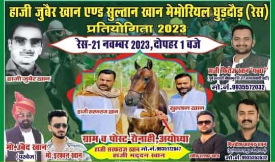 सोहावल क्षेत्र के रौनाही स्थित घुड़दौड़ फील्ड पर होगा प्रतियोगिता का आयोजन।देश के अनेक प्रदेशो से घुड़सवार प्रतियोगिता मे होंगे शामिल। प्रतियोगिता में शामिल विजेता व उपविजेता को पुरस्कार देकर किया जायेगा सम्मानित। सोहावल के भूतपूर्व ब्लाक प्रमुख रौनाही निवासी फिरदौस अहमद खान ने दी जानकारी।