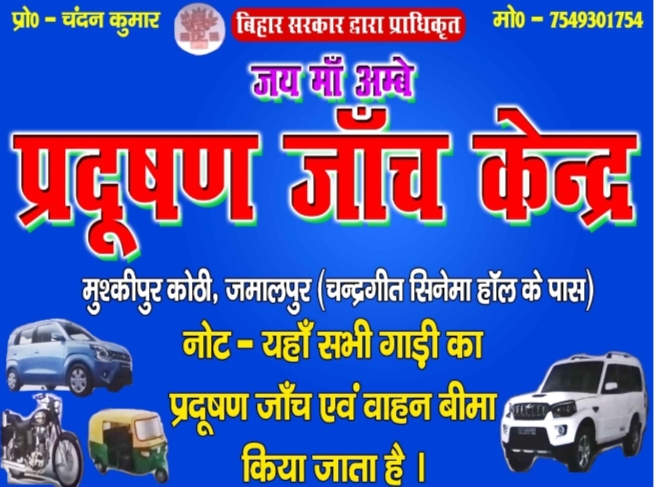 बिहार के खगड़िया जिला के गोगरी प्रखंड के जमालपुर से रविंद्र कुमार प्रजापति मोबाइल वाणी के माध्यम से जानकारी दे रहे है कि चंद्र सिनेमा हॉल के पास वाहन प्रदूषण जांच केंद्र खुल जाने से जमालपुर के नागरिकों में खुशी का माहौल देखने को मिल रहा है। यहां के नागरिकों के द्वारा बताया जा रहा है कि पहले सभी गाड़ियों को पोलूशन डॉक्यूमेंट बनवाने के लिए महेशपुर जाना पड़ता था।